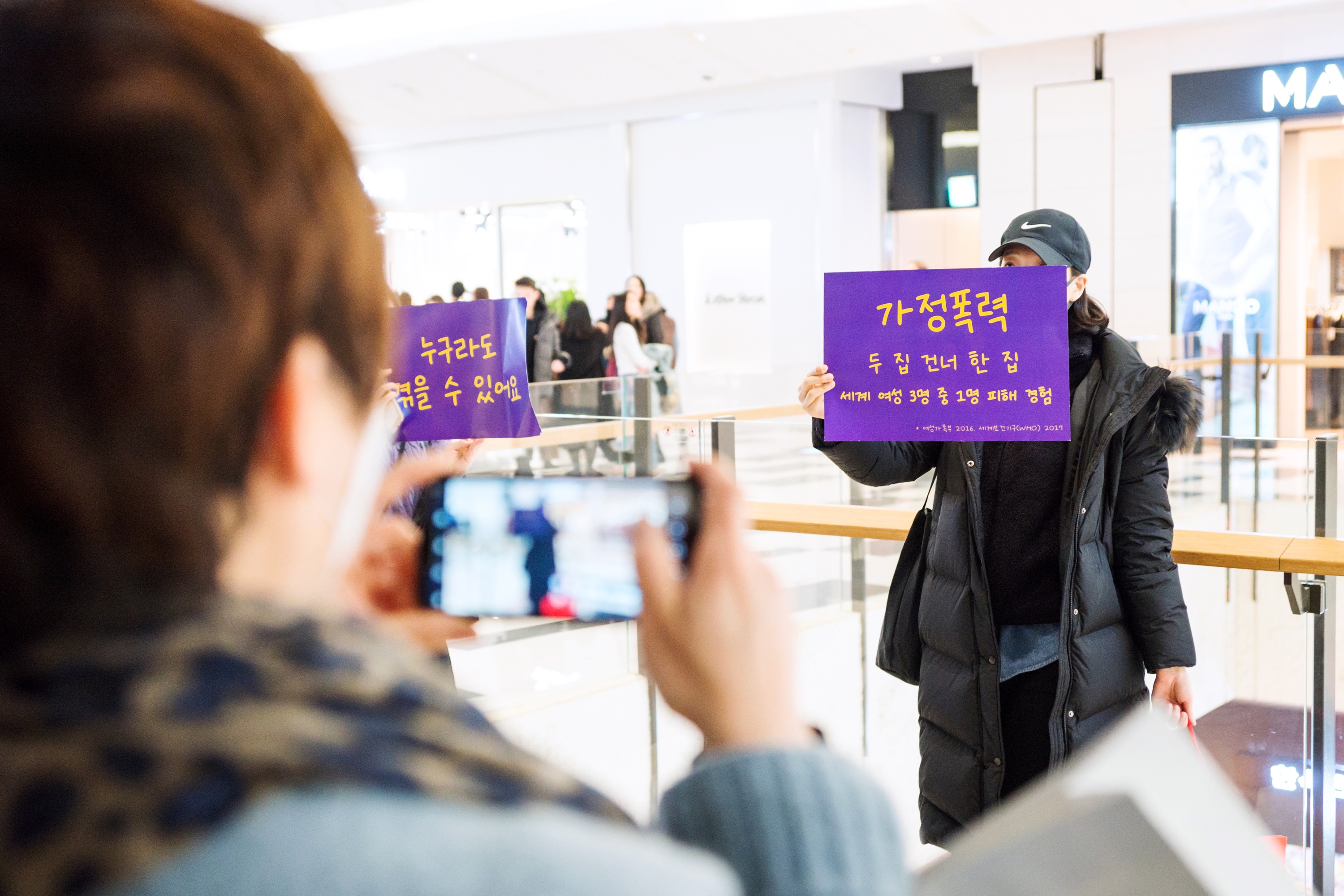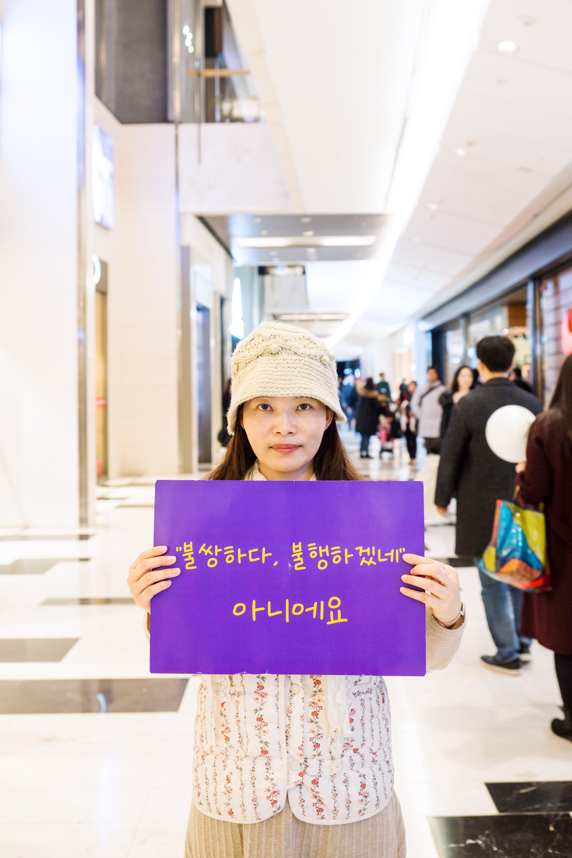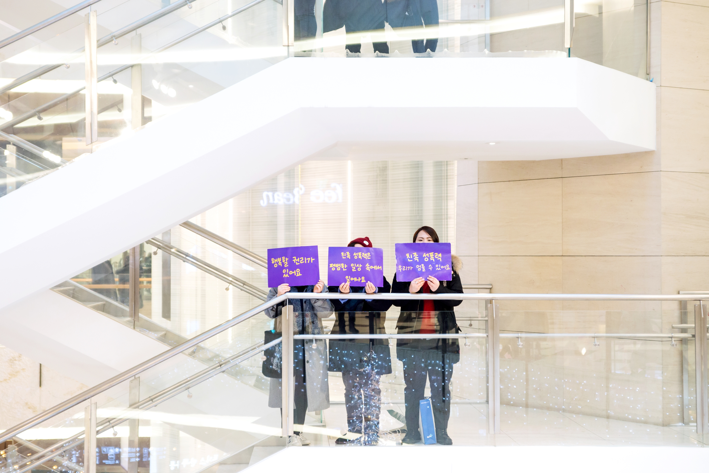 가족 단위 방문객들로 붐비는 여의도 IFC몰에서도 <친족 성폭력 공소시효 폐지부터> 액션은 계속되었습니다. 비록 사전에 계획했던 대로 퍼포먼스를 진행하지는 못했지만, 저마다 흩어져서 일상 공간을 배경으로 친족 성폭력 문제를 알리는 피켓 사진을 찍었습니다.