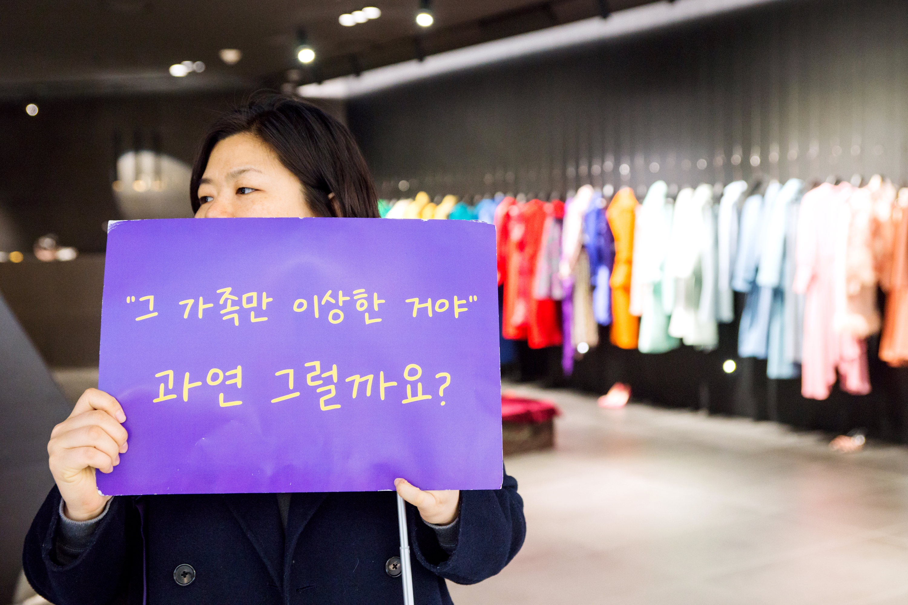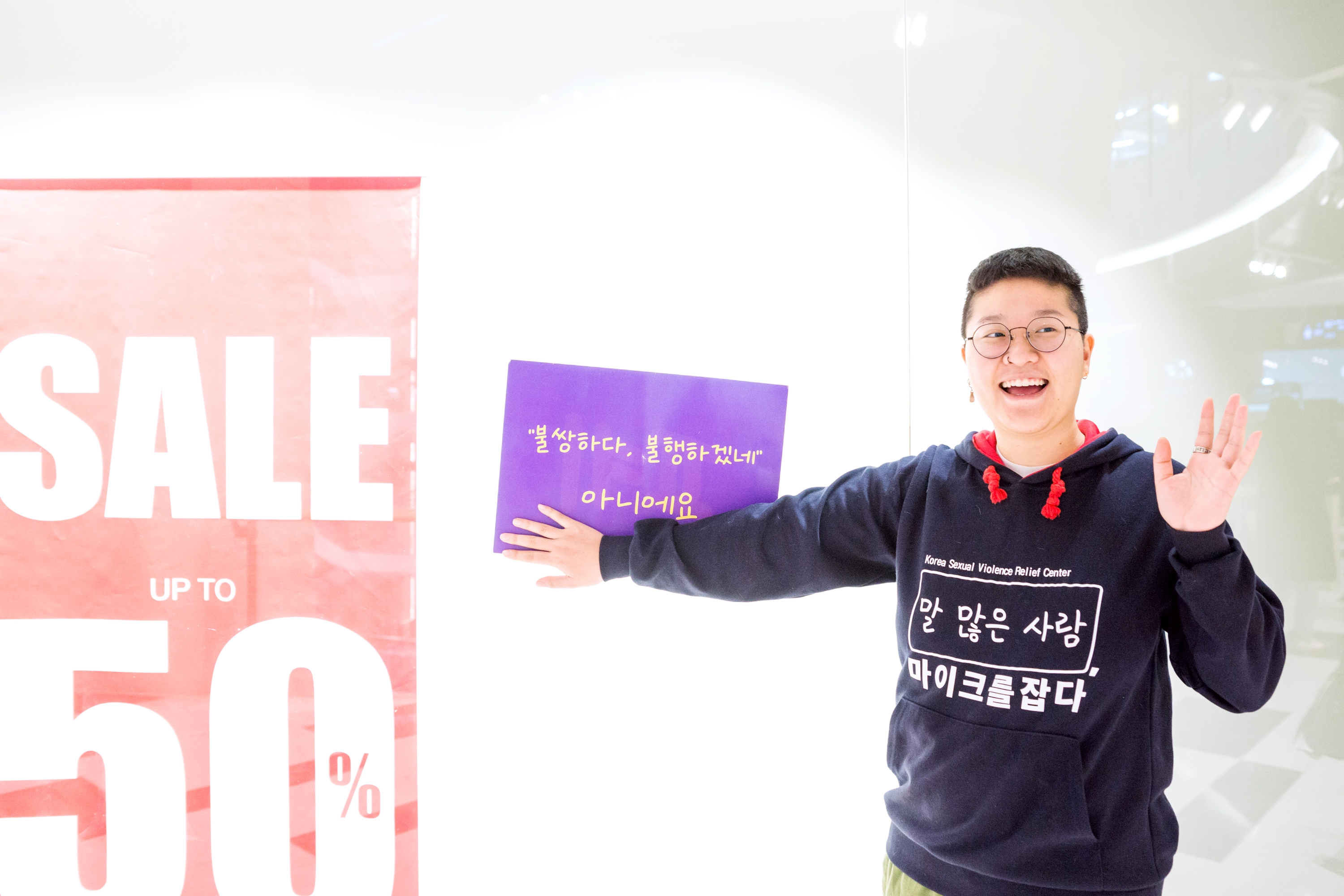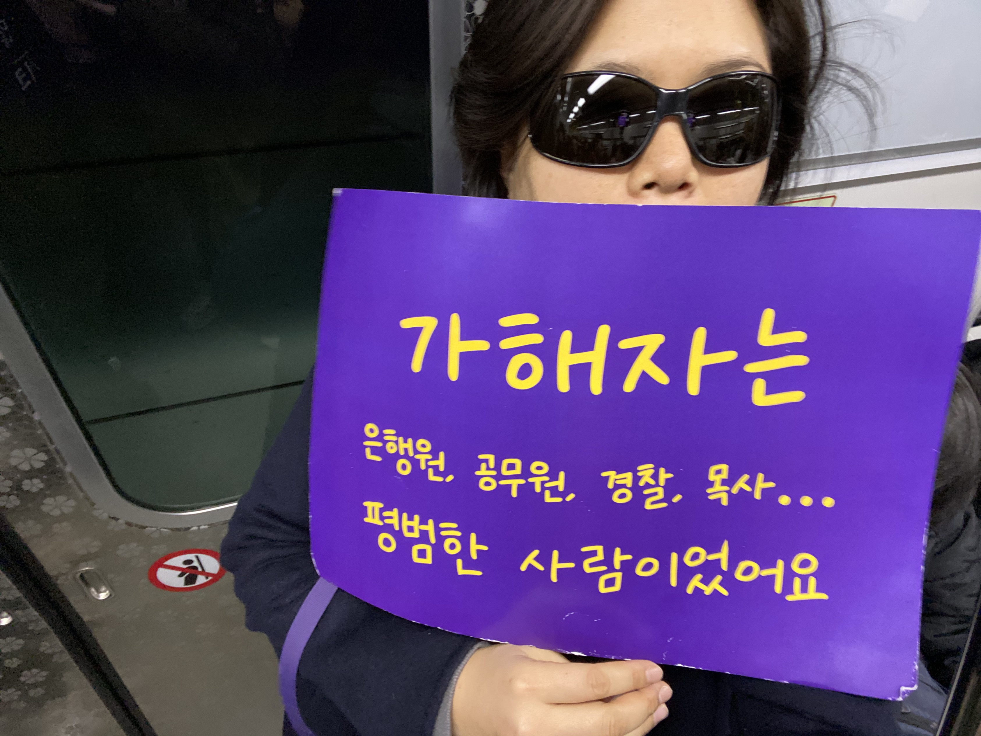 ‘친족 성폭력’이라는 단어가 나도 아직 불편한데 보는 저들은 어떨까 싶었어요. 꺼내고 싶지 않은 상자를 여는 거잖아요. 나도 덮어두고 싶은데. 그런데 지나가던 아이가, 이제 글을 읽기 시작했나 본데, 또박또박 큰소리로 ‘친족 성폭력’이라고 읽더라고요. 내가 들고 있는 내용이 뭔지 나한테 들려주는 것 같았어요. 그 엄마도 그냥 보고 계셨고요. 유인물 나눠줄 때도 받아줘서 좋았어요. 그 글자를 보고 못 볼 걸 본 것처럼 고개 돌리는 사람은 없었어요. 편안하게 즐기듯이, ‘투쟁, 투쟁’ 하지 않고, 과격하지 않게, 나도 심각한 표정을 짓지 않아도 되는, 편안한 액션이라 좋았던 것 같아요.