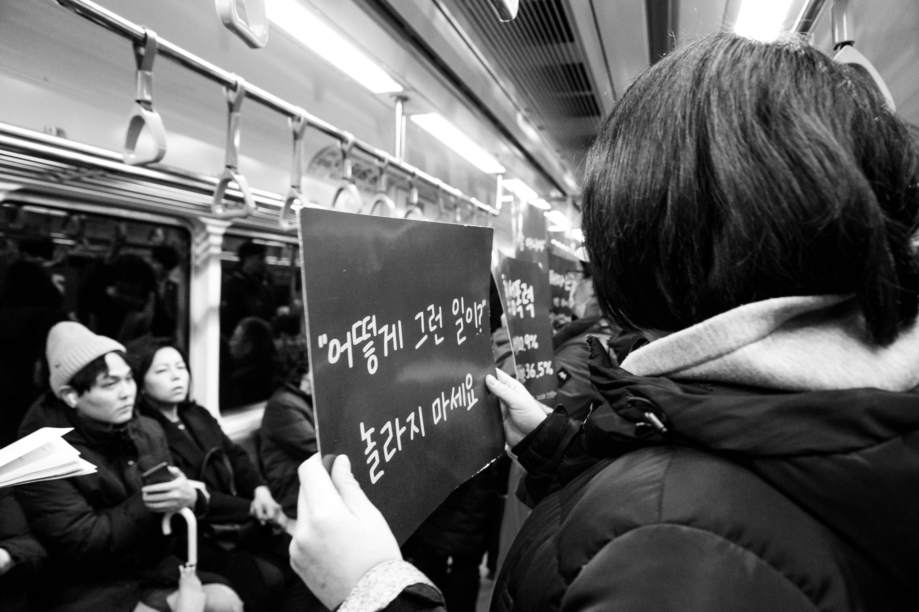 5호선 지하철 안에서는 친족 성폭력의 ‘일상성’과 ‘평범성’을 알리는 퍼포먼스를 진행했습니다. 삼삼오오 평범하게 지하철을 타고 가다가 캠페인단 한 명이 노래를 부르면 다 같이 피켓을 꺼내어 들고 유인물을 나눠주는 퍼포먼스였습니다.