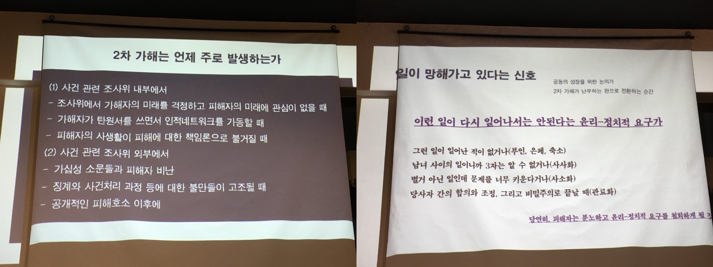 가해자를 배제해야 한다는 차원에서 하는 얘기가 아니라 어떻게 하면 피해자가 생존해서 살아갈 수 있는가…… 성폭력 피해에 연대하는 것은 자신의 이득이라든지 그런 문제로 봐서는 안 되고, ‘피해자에게 연대해준다’라는 시혜적인 태도를 보여서도 안 된다고 생각합니다. ‘그럼에도 불구하고’ 결단을 분명히 내려야 하고, 불편이나 어려움을 감수할 필요도 있어요. 그래야 피해자가 이 사회에서 살아가는 게 조금이라도 더 편하지 않을까.
