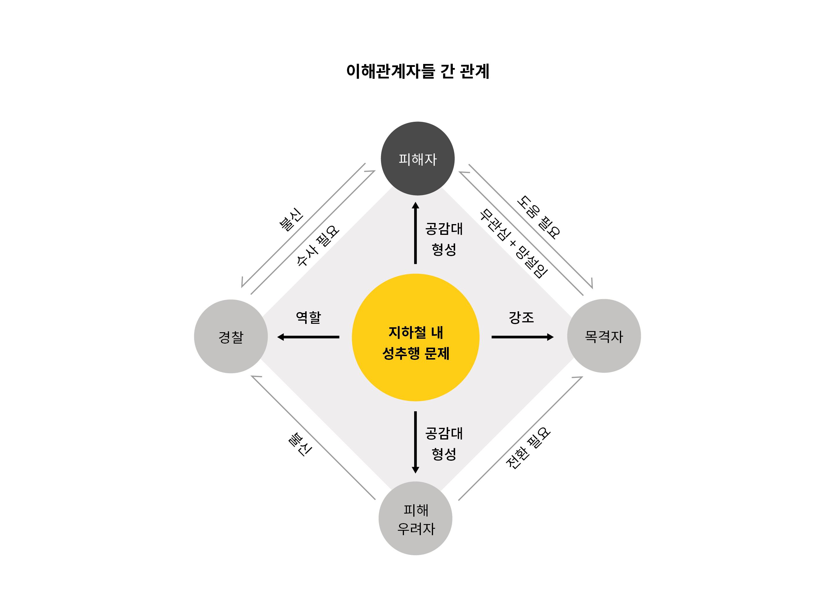 작게는 피해자 주변의 친구나 친지, 가족, 그러니까 피해자의 직접적인 주변인. 중간 범위는 피해자가 어떤 사건을 겪었든 그 층위에 연관된 사람들. 더 넓게는 이 사회의 모든 사람이 성폭력 주변인이라고 할 수 있을 것 같아요.
