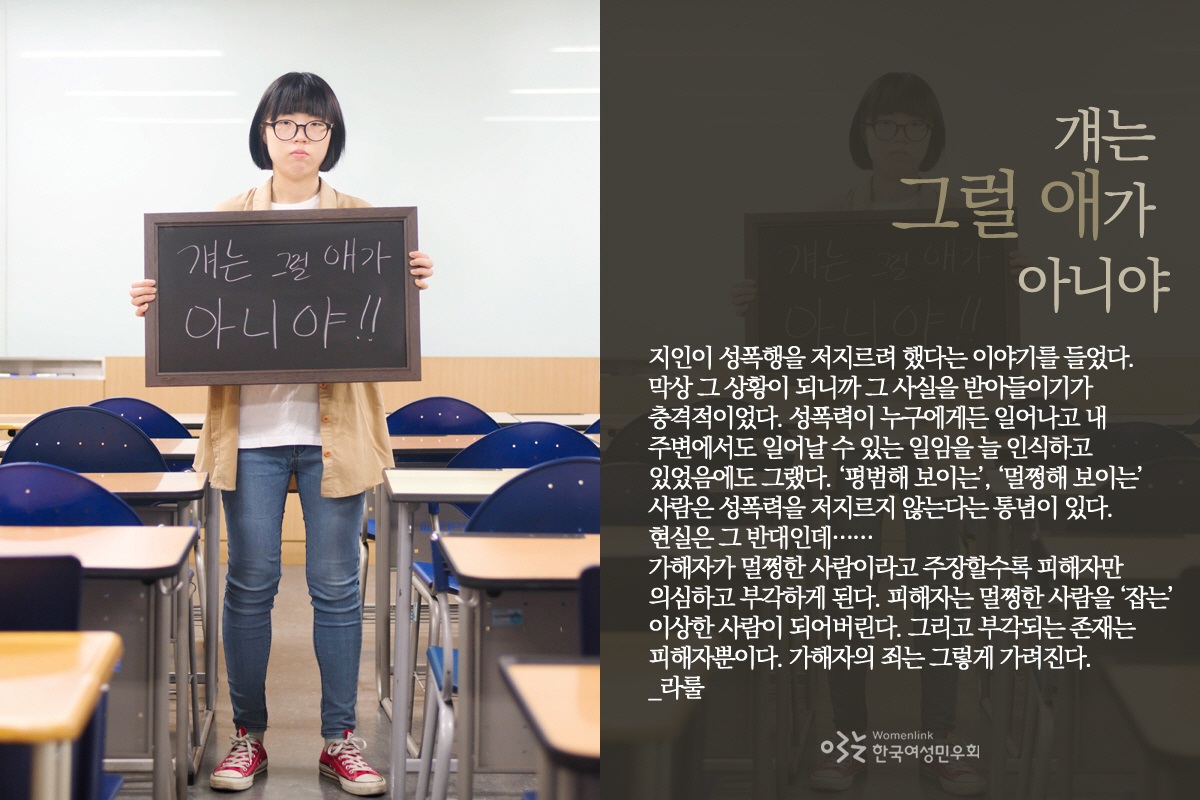 얼마 전에 제 지인 중에 성폭력 가해자인 사람을 봤어요. 그 지인을 알고 지낸 지 10년이 넘었는데, 정말 단 한 번도 그 사람이 그럴 거라고 생각해본 적도 없고 그런 낌새를 느껴본 적도 없었던 것 같아요. 뭐가 사람을 저렇게 만들까? 어떤 부분이, 어떤 트리거가 작용하면 성폭력이 발동되는 걸까? 이런 고민을 많이 하게 된 것 같아요.