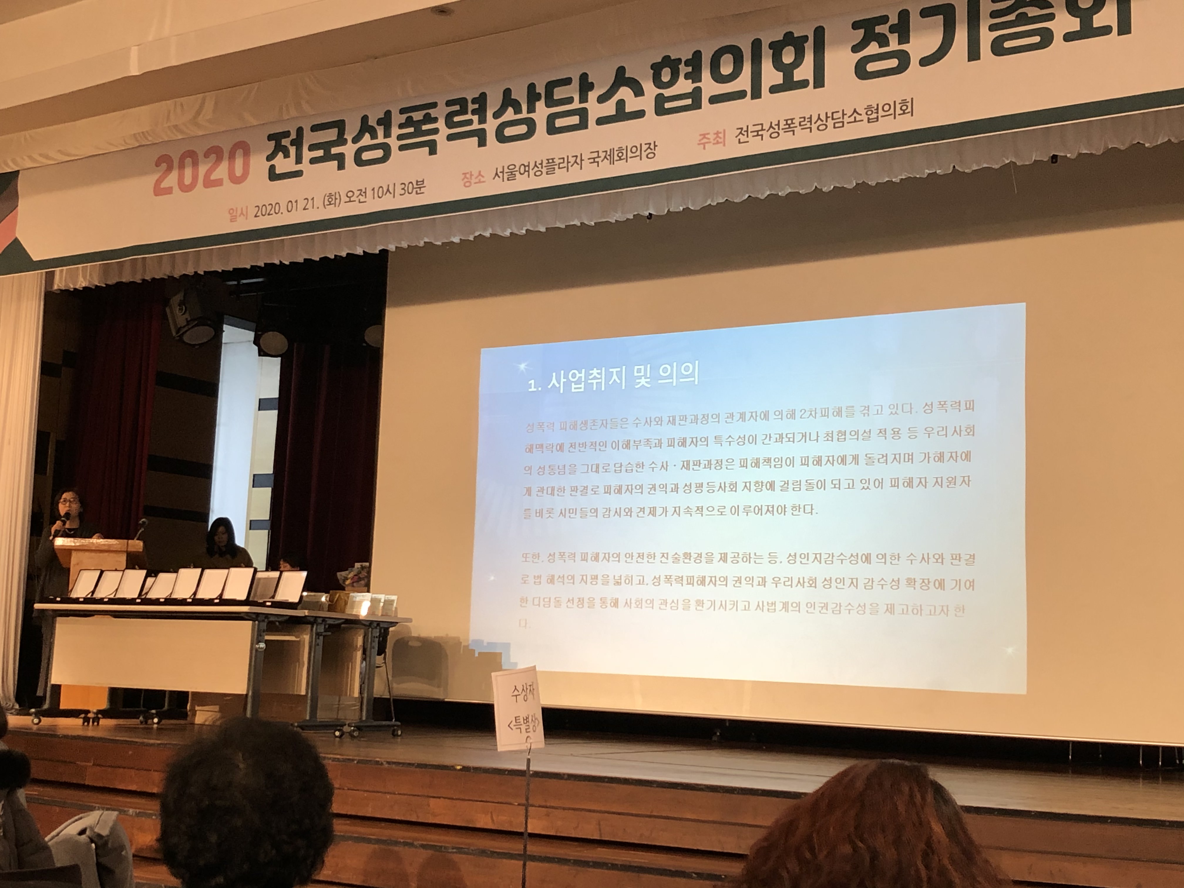 지난 1월 21일, 전국성폭력상담소협의회 제 20차 정기총회가 열렸습니다. 전국의 성폭력상담소 활동가 여러분들이 모여 지난 전성협 활동을 평가하고, 앞으로의 계획을 세우는 자리였습니다.