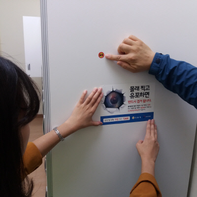 여성분들이 공중 화장실을 이용할 때 두렵다는 말씀을 하셨었고요. 들어보니까 구멍이 그렇게 많대요. 이상한 휴지 같은 게 꽂혀 있는 경우도 있고, 스티커로 가려져 있는 것 같은 느낌이 든다는 이야기들을 해요. 나사못 같은 게 여러 개 박혀있고. 그 이야기를 몇 번 듣고 나서 남자 화장실에도 있는지 둘러 봤는데, 있어요. 남자 화장실에도 있어요. 구멍이 굉장히 많고, 휴지로 막혀있고.