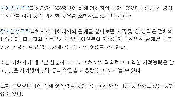가까운 통계를 보면요. 2018년에 장애인성폭력상담소에서 예방하거나 전화를 통해서 상담을 의뢰한 분이 한 1,300여 명 정도 된다고 해요. 한해 통계였거든요. 그분들이 (통계를) 낸 건 어려운 여건 속에서 기관을 찾아서 도움을 요청하는 경우지만, 대부분의 장애 여성분들은 그런 기관을 찾아가기도 어렵고, 폐쇄적인 집안 가정환경에서 반복적인 피해를 당하는 경우가 많이 있어요. 결국에는 밖에 드러나는 경우는 수년 내지 십여 년 이상 피해를 반복적으로 당해온 경우가 많거든요. 법원까지 이 이슈가 올라오고 사회적인 공론화가 되기까지 얼마나 많은 고통을 당하시겠어요. 그런데 피해자분들에 대해서 비판적인 여론을 만들어내는 분들도 계시고, 또 판결이 좀 부당하게 나오는 경우도 있어서 제가 관련된 이슈를 SNS에 게시하고 사람들에게 의견을 구하는 등 여러 가지를 하고 있어요.