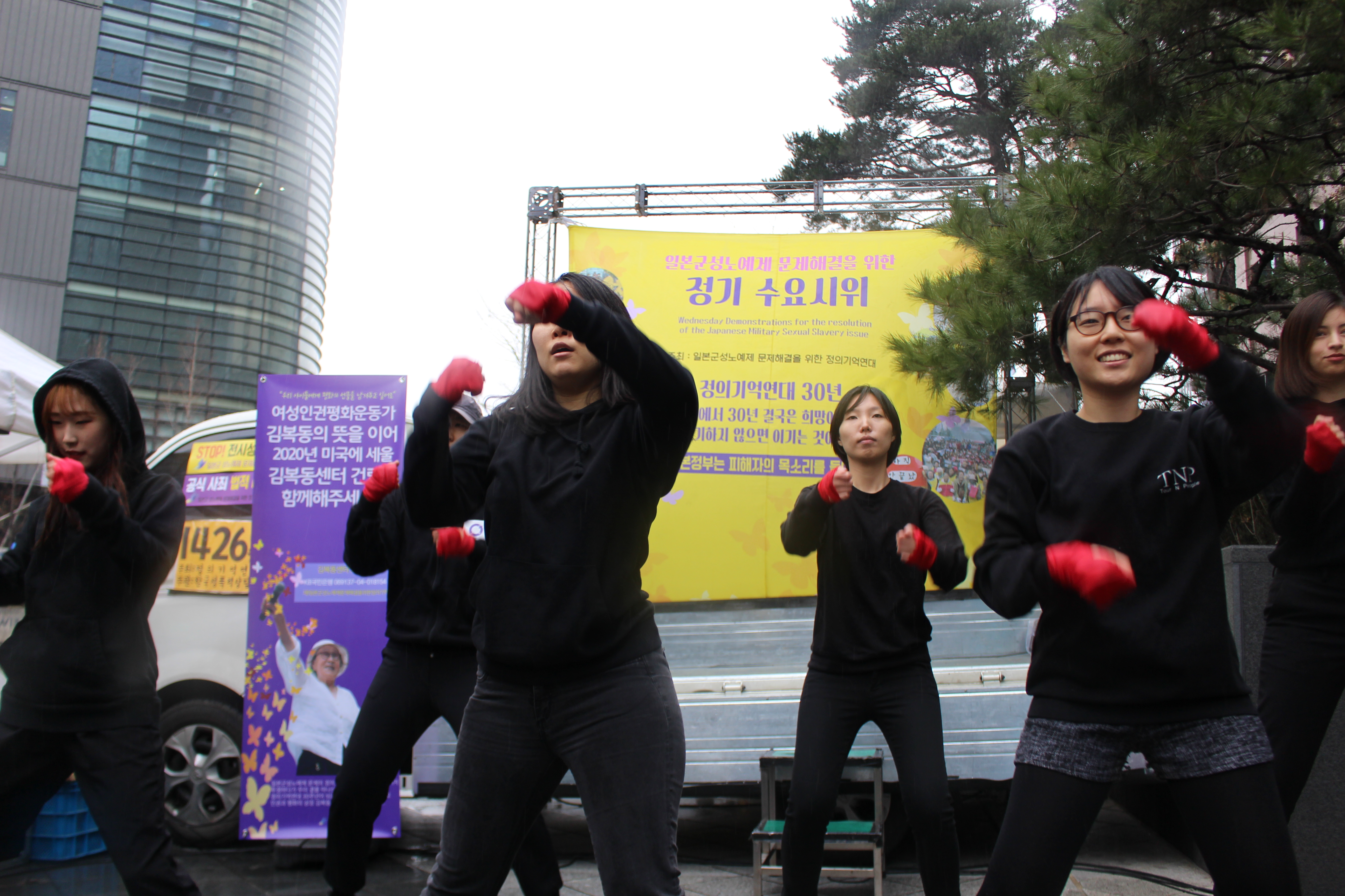 손에 질끈 감은 빨간 끈은 여성에 대한 폭력을 끝장내겠다는 전사의 의지를 연상시켰습니다. 자기방어훈련 동작을 응용한 안무에 맞춰 절도있게 내지르는 모습이 인상적이었습니다.