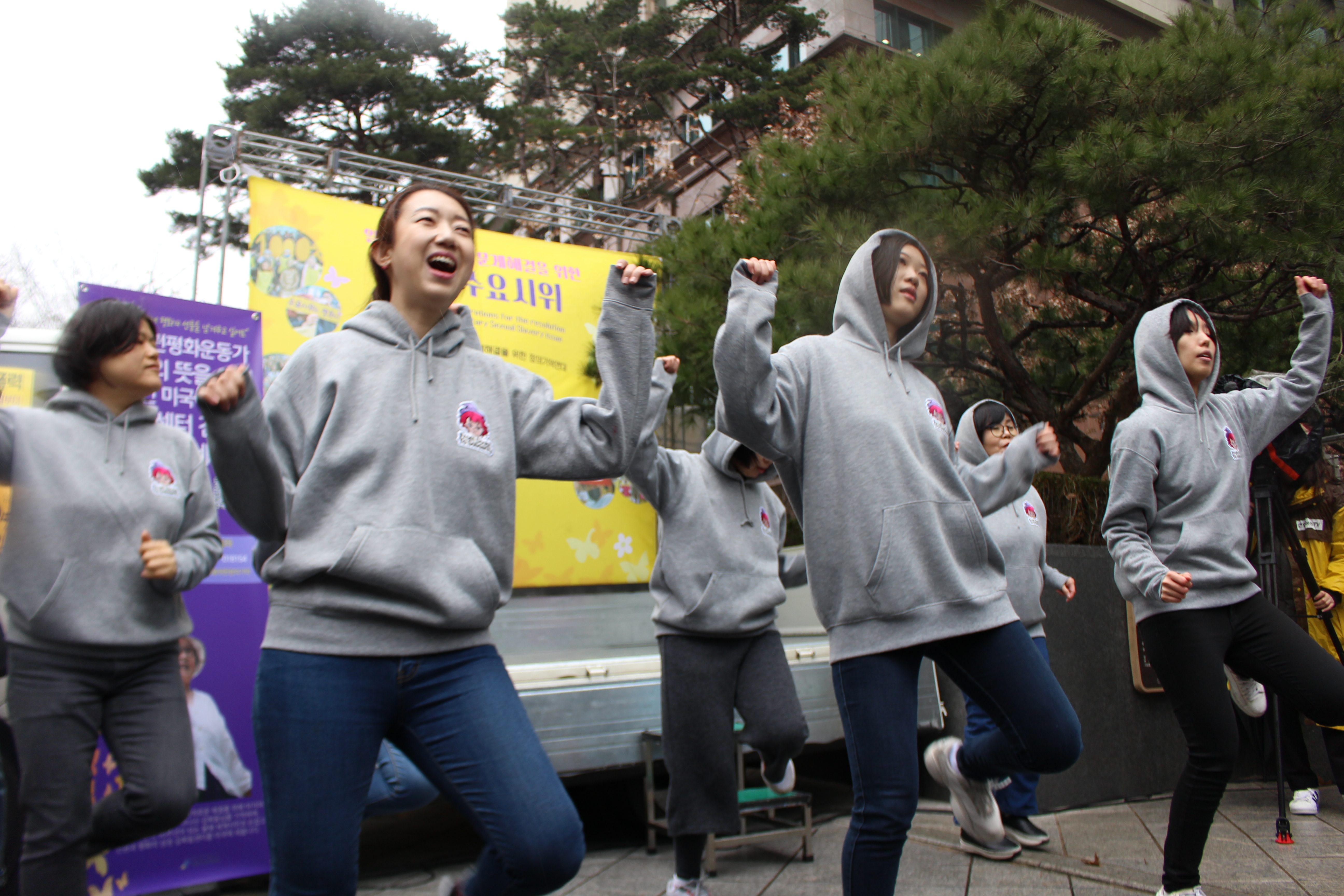 다 함께 성명서의 구호를 외치고 수요시위를 시작했습니다.