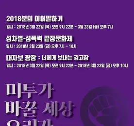 지난 3월 22일-23일 청계광장은 성차별과 성폭력을 없애기 위한 '2018분의 이어말하기', '성차별·성폭력 끝장문화제', '행진' '대자보 광장:너에게 보내는 경고장' 등의 활동으로 가득 매워졌습니다. 1박 2일 간의 액션들은 의 주최로 진행 되었는데요, 추위에도 불구하고 많은 시민분들이 오셔서 목소리 내주셨고 경청하고 박수치고 함께 변화를 외쳤습니다. 2018분 동안의 이어말하기는 우리 사회 곳곳- 학교, 일터, 가족, 친밀한 관계, 공공장소, 온라인 공간...에서의 성차별과 성폭력을 고발하는 장이었습니다. 그 자리에 있는 많은 발언자들은 여성들이었습니다. 청소년, 이주여성, 성소수자 여성, 장애여성, 대학생, 성매매 여성, 요양보호사 여성, 중년 여성.. 여러 정체성과 위치의 여성들이 이야기를 해..