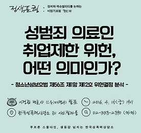 전체 글 썸네일형 리스트형 ① ‘술과 약물을 이용한 성폭력 방지 캠페인’을 시작하며 비명에 가까운 캠페인 ‘술과 약물을 이용한 성폭력 방지 캠페인’을 시작하며 가온 성폭력에 대해 이전과는 다르게 사고하게 되길 술과 약물을 이용하여 발생하고 있는 성폭력에 대한 예방 캠페인을 하기로 한 것은 즉흥적인 일이었다. 작년 10월, 여성혐오에 반기를 든 메갈리아 활동이 한창이었고, 여성을 대상으로 한 몰래카메라 촬영물 유포 근거지였던 소라넷이나 그와 유사한 남성들의 성문화에 대한 폭로로 온라인이 들끓던 시기였다. 나 역시 분노가 목구멍까지 차올라 있었다. 그것은 특별한 감각이었다. 분노 자체보다도, ‘함께 분노한다’는 감각이 있었기 때문이었다. 그러한 감각이 그저 시간의 흐름 속에 사라지지 않았으면 했다. 무력감이 닥쳐오기 전에 무엇인가 함께 할 수 있는 사람들을 만나고 싶었다. 그래서 한국성폭력.. 더보기 [회원소모임] 남성성 모임, 그 첫 번째 시간 남성성 모임, 그 첫 번째 시간 개꽃 (회원) ▲ 이날의 장소 누가 남자인가? 남자답다는 것은 어떤 것인가? 남성성이란 무엇인가? ‘정상적’인 남성성은 무엇인가? ‘정상적’인 남성성을 ‘쟁취’하기 위해 무엇을 하는가? ‘비정상’적으로 여겨지는 남성성은 무엇인가? 사회가 ‘남성성’이라고 부르는 것은 어떤 것인가? 사회가 ‘남성성’이라고 부르지 않는 것은 어떤 것인가? ‘남성성’으로부터 열외 되는 사람과 정체성과 문화는 어떤 것인가? 남성에게 ‘폭력’은 피할 수 없는 것인가? 여성성이란 무엇인가? 여성은 남성성을 가질 수 없는가? 여성에게 남성성은 존재할 수 없는가? 존재하지 않는가? 남성성은 페니스 있는 이에게만 허락 되는 것인가? 페니스가 없음에도 실천할 수 있는 남성성은 없는가? 증명할 수 있는 ‘남성.. 더보기 2016 성평등한 사회를 위한 성폭력 판례뒤집기 모의법정 안내 및 참가신청 2016 성평등한 사회를 위한 성폭력 판례뒤집기 모의법정 안내 및 참가신청 2016 성평등한 사회를 위한 성폭력 판례뒤집기 모의법정(부제: 영화감독에 의한 10대 여성 성폭력 사건 대법원 무죄판결 다시 짚어보기)성폭력 사건에 대한 올바른 판결을 도출할 수 있는 방향을 제시하는 모의법정은 일반 시민들의 참여를 유도하고 젠더 관점을 반영한 판결을 이뤄내기 위한 사회적 공감대를 확산하고자 마련되었습니다.- 일시: 2016년 4월 28일 목요일 오후 3시 - 장소: 이화여자대학교 모의법정 (법학관 405호) - 주최: 연예기획사 대표에 의한 청소녀 성폭력 사건 공동대책위원회, 이화여자대학교 젠더법학연구소, 한국성폭력상담소 - 주관: 한국성폭력상담소 - 후원: 한국여성재단>> 배심원단 및 방청 신청 - 신청 페이.. 더보기 [정색포럼] 성범죄 의료인 취업제한 위헌, 어떤 의미인가? 정치와 섹슈얼리티를 논하는 비정기포럼 [정색포럼] 첫번째 성범죄 의료인 취업제한 위헌, 어떤 의미인가? - 청소년성보호법 제56조 제1항 제12호 위헌결정 분석 - 발표 이경환 변호사 ((유)태평양) 일시 2016.4.15(금) 19시 장소 한국성폭력상담소 B1 이안젤라홀 문의 02-338-2890 (차차) 주관 (사)한국성폭력상담소 더보기 연예기획사 대표에 의한 청소녀 성폭력사건의 제대로 된 재상고심 판결을 촉구하는 의견서 및 서명지 제출 기자회견 연예기획사 대표에 의한 청소녀 성폭력사건의 제대로 된 재상고심 판결을 촉구하는 의견서 및 서명지 제출 기자회견 3월 30일 낮 12시, 대법원 정문 앞에서연예기획사 대표에 의한 청소녀 성폭력사건의 제대로 된 재상고심 판결을 촉구하는 기자회견이 진행되었습니다. 만 15세의 피해자를 성폭력하여 임신하게 이른뒤, 집을 나오게 하여 자신의 영향력 아래 두고 지속적으로 성폭력을 가하였음에도 불구하고 서로 사랑하였다는 가해자의 주장이 받아들여져 무죄취지로 대법원에서 파기환송된 후, 2015년 10월 파기환송심에서 무죄판결을 받은 이 사건은 현재 대법원에 재상고 되어 있습니다. 이 사건이 언론 보도를 통해 알려진 이후, 많은 시민분들이 함께 공분하였는데요. 제대로 된 판결을 촉구하기 위해 총 340개의 전국 여성시민.. 더보기 금복주 불매선언 및 여성•노동계 기자회견 후기 여성노동자 결혼퇴직 관행 철폐를 위한 금복주 불매선언 및 여성•노동계 기자회견 후기 2016년 3월 29일 오전 11시 광화문에서는 58년동안 여성노동자에게 결혼을 이유로 퇴사를 강요해 온 대구지역의 중견 주류 회사 금복주에 대한 불매선언과 여성/노동계의 기자회견이 있었습니다. 이미 1987년에 제정된 남녀고용평등법(현행 남녀고용평등과 일·가정양립 지원에 관한 법률)에서 혼인을 이유로 한 차별을 금하고 있지만, 이러한 법을 비웃기라도 하는 듯 58년의 역사와 전통을 자랑(!!)하는 금복주는 버젓이 여성노동자에 대한 차별적인 인사관리를 자행하고 있었습니다. 한국성폭력상담소를 비롯하여, 여성노동법률지원센터, 전국민주노동조합총연맹 여성위원회, 전국여성노동조합, 한국노동조합총연맹, 한국여성노동자회, 한국여성단체.. 더보기 [4.13총선 페미니스트 유권자 캠페인] 나는 페미당, 너는 안된당! [4.13총선 페미니스